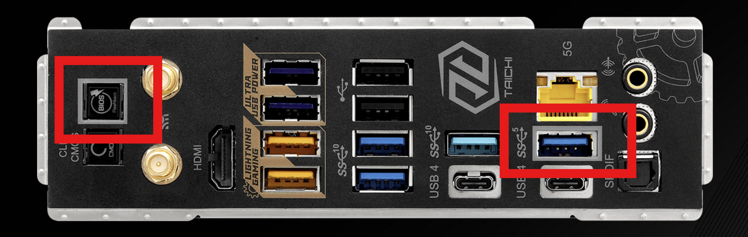 - Locate the dedicated BIOS Flashback USB port on the rear I/O of your ASRock motherboard
