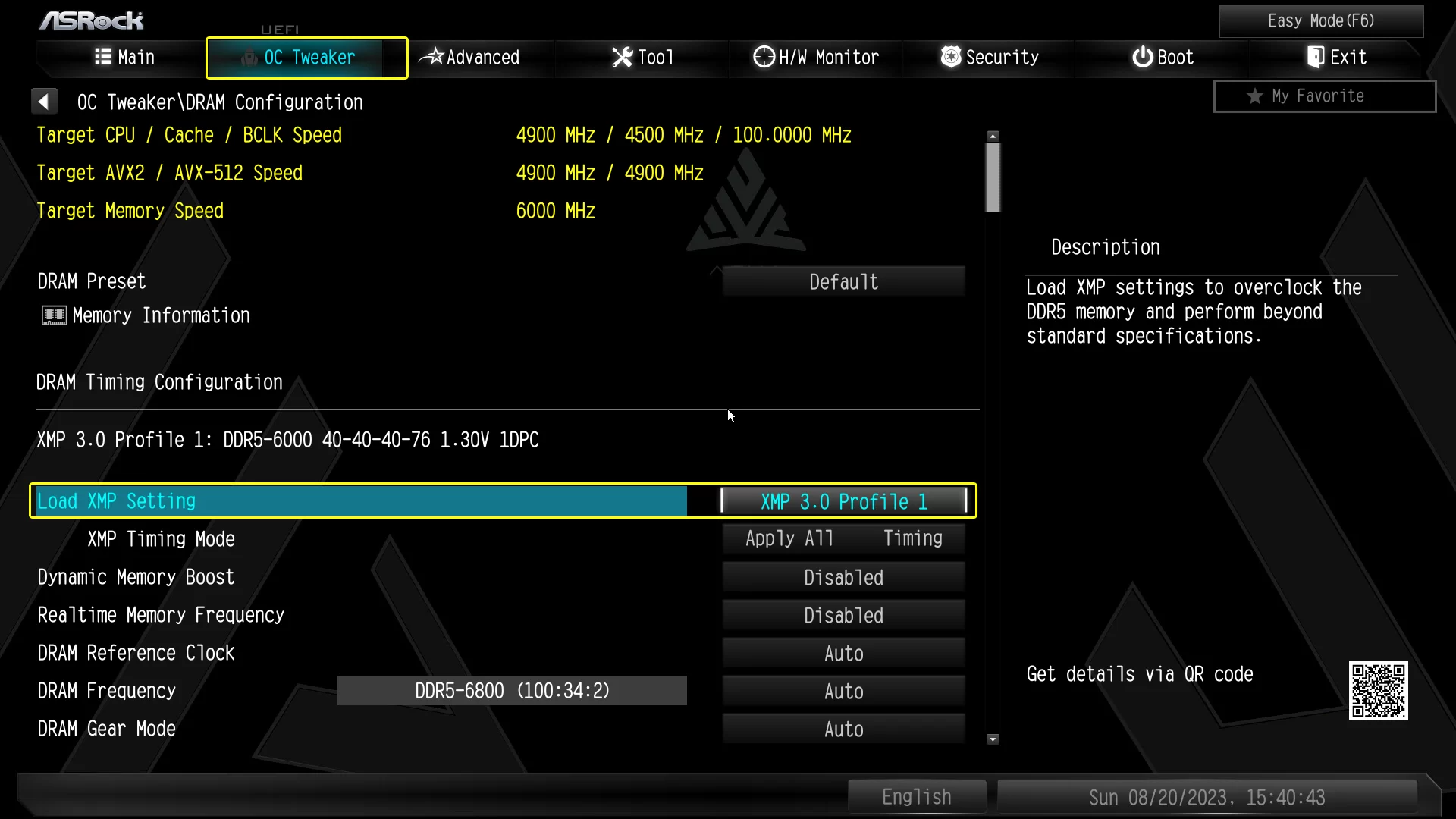 - For Intel processor systems: Go to OC Tweaker > DRAM Configuration > Load XMP Setting > update from Auto to Profile 1