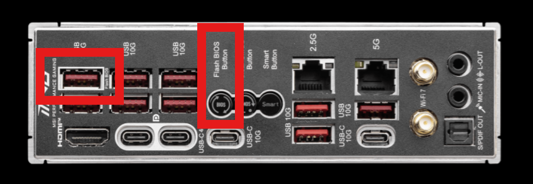 - Locate the dedicated BIOS Flashback USB port on the rear I/O of your MSI motherboard (this port is usually labeled “BIOS” or has a small outline around it)