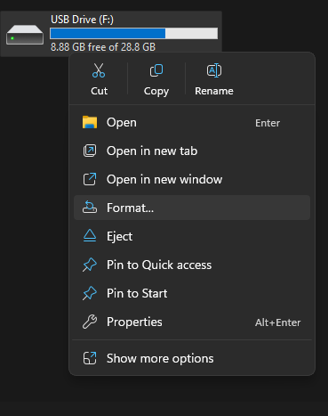 - Right-click the USB drive you are wanting to format and select "Format..."