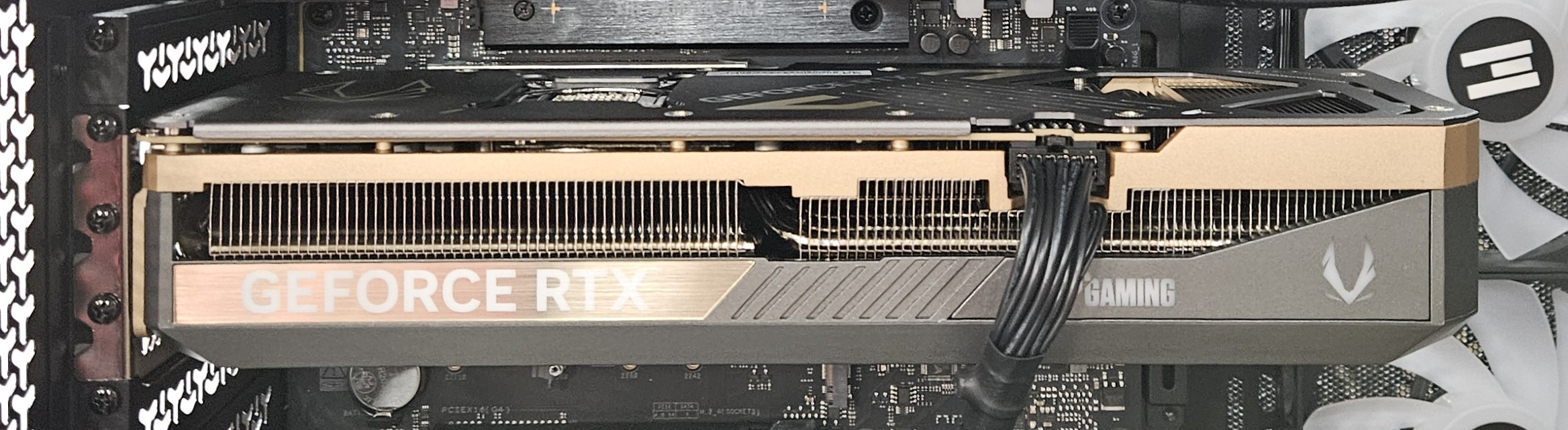- Locate the graphics card. It is the large component connected to a PCIe slot on the motherboard (see examples below)