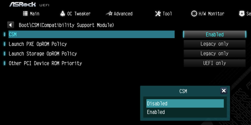 - Go to Boot > CSM (Compatibility Support Module) and set CSM to Disabled