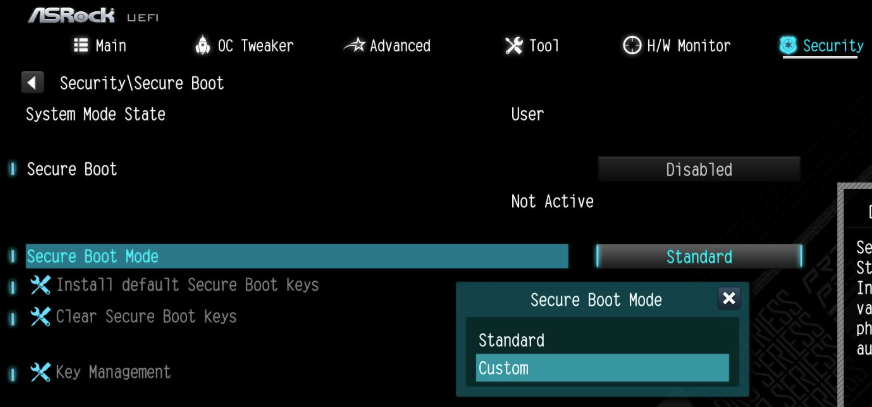 - Go to Security > Secure Boot and set Secure Boot Mode to Custom