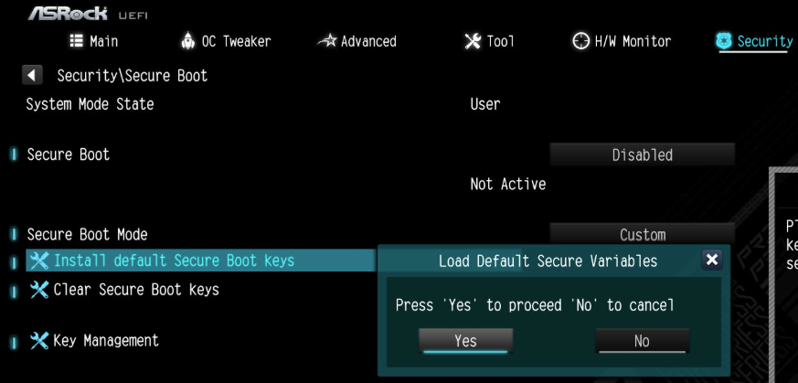 - Now, go to Key Management, and select install default Secure Boot keys, then when prompted to Install Default Secure Variables click Yes