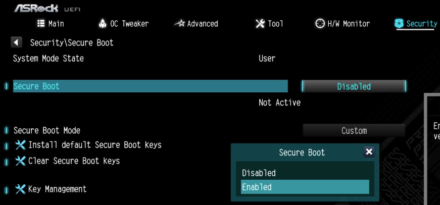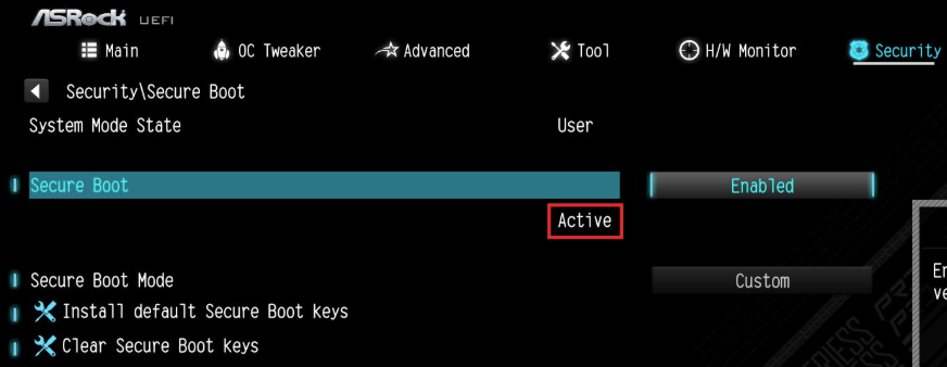 - After the system restarts, go to Security then Secure Boot, and make sure that Secure Boot is showing Active.