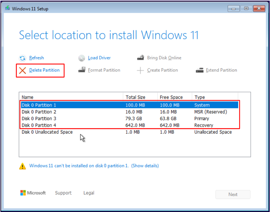 - When asked what disk to install Windows to, delete all partitions on Disk 0 that aren't listed as Unallocated Space. Partitions are deleted by selecting and highlighting each one individually and then selecting ❌Delete Partition
