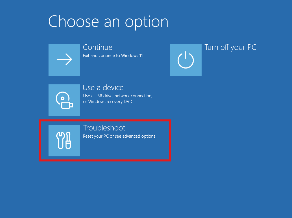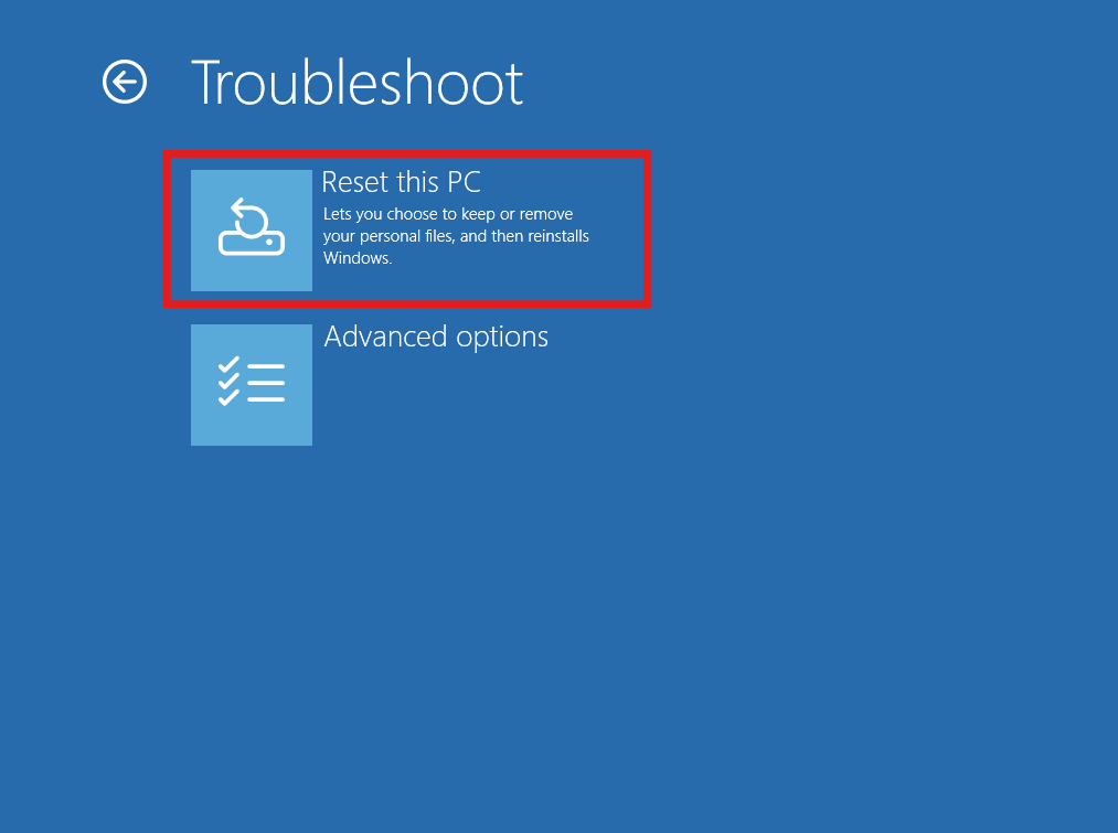- Select Advanced Options, then Troubleshoot, then Reset this PC