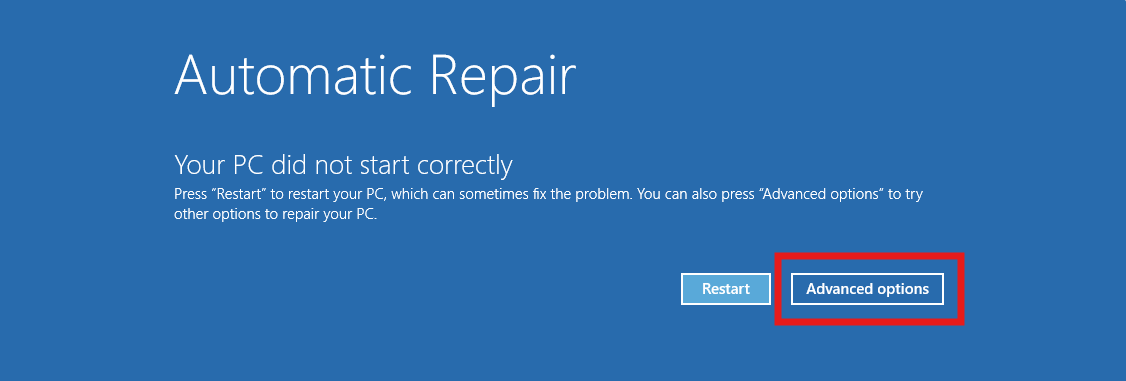 - Repeat the above steps two more times. On the third restart your system will enter the Windows Recovery Environment (Windows RE or WinRE) and Advanced Options are displayed (see image below)