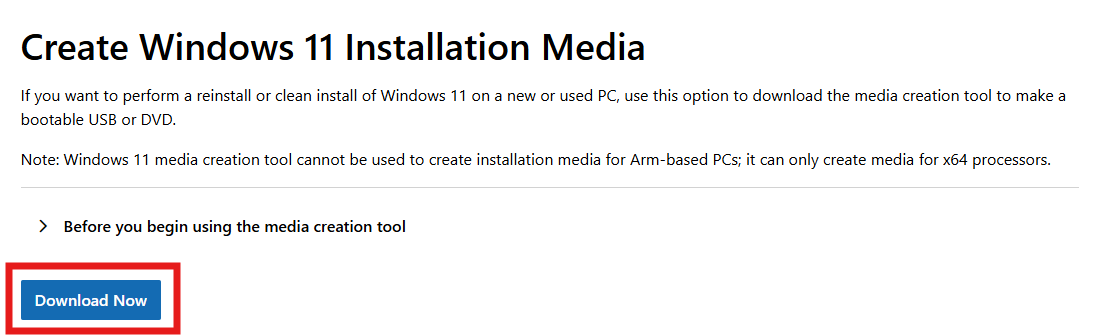 - Under the Create Windows 11 Installation Media section, select Download Now. The MediaCreationTool.exe will download