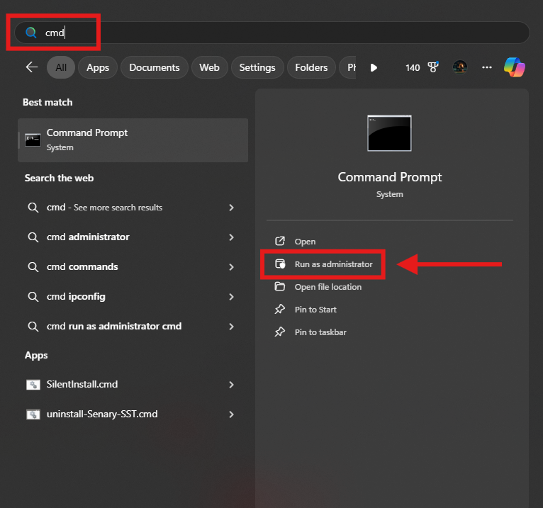 - Open the Start Menu and type "cmd", then tight-click Command Prompt and select Run as administrator