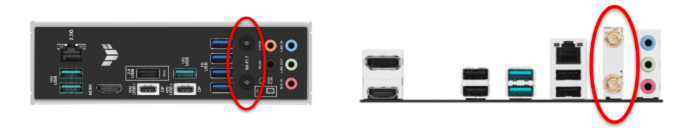 Find the two Wi‑Fi antenna posts (often brass screw‑on or black push‑in types).