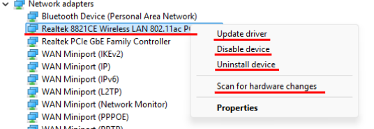 Use Device Manager to reinstall the Wi‑Fi adapter, then update drivers.